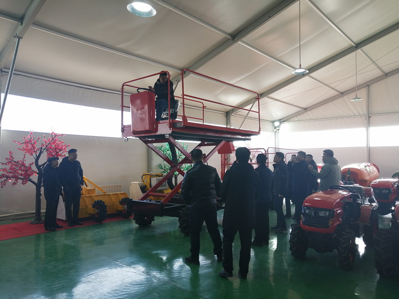 在果園機械展廳里,領導們對保東公司的果園管理機進行了詳細的了解,詢問果園配套機械的質量和性能指標完成情況、整機生產與制造情況與產品的主銷市場、售價、服務、渠道等多方面的內容,公司總經理王光宇針對相關問題進行了客觀解答。然后業務部彭經理現場為各位領導演示果園專用多功能作業平臺。